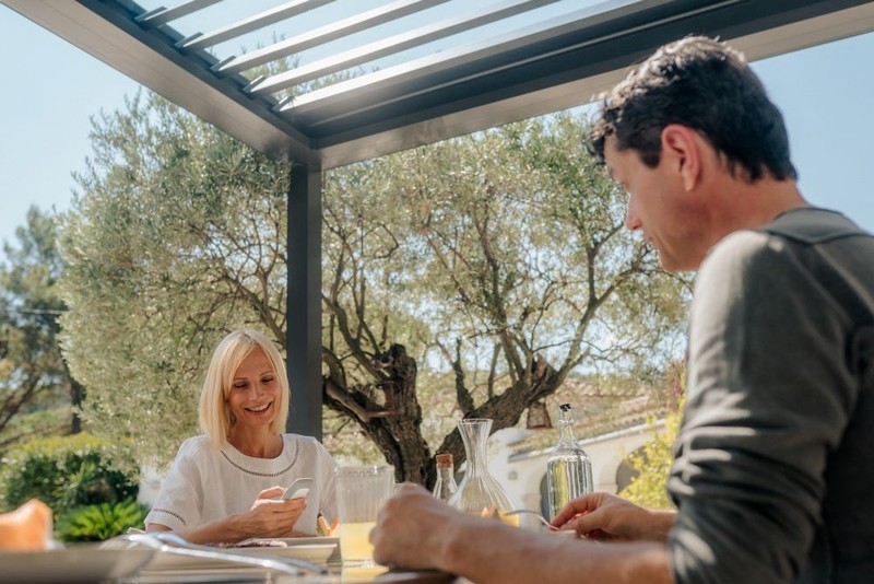 Wer sich für eine Pergola mit drehbaren Lamellen entscheidet, kann auch bei stärkerem Wind oder Regenschauern das Outdoorgefühl ohne Unterbrechung auskosten. Einfach clever: Die smarte Steuerungslösung von Somfy für drehbare Lamellendächer ist im Nu vom Fachhandwerker installiert und gewährleistet eine natürliche Belüftung und ein optimales Klima. Sensorbasiert können fünf vordefinierte Wetterszenarien mit den jeweiligen Lamellenneigungen für Schnee, Wind, Frost, Regen und Sonne ausgeführt werden. Für eine maßgeschneiderte Anpassung an die Gegebenheiten vor Ort lässt sich die Empfindlichkeit der automatischen Hinderniserkennung ebenso wie die Einstellung der Lamellenwinkel individuell einstellen. Egal, ob bei einer freistehenden oder einer festmontierten Überdachung – dank Smart-Home-Ready-Technik sind auch nachträgliche Erweiterungen ohne zusätzliche Steuerleitungen jederzeit problemlos möglich.